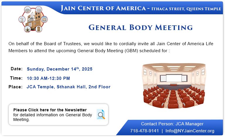 We would like to cordially invite all Jain Center of America Life Members to attend the upcoming Annual General Body Meeting...